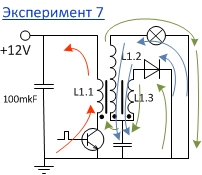 Первый цикл - подаем импульс на первичку L1.1 трансформатора и вторичка L1.2 на прямом ходу прокачивает ток через лампу и закачивает электроны в конденсатор.