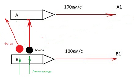 Riba123, Тела/корабли/Звёзды движутся вместе со средой-эфиром, но не всем, а куском/оболочкой, который их окружает, если тела движутся примерно одинаково, как в нашем случае корабли, то они образовывают между собой почти однородную среду, отсюда и бомба и фотоны будут двигаться по плюс минус прямой, т.е. фотон сноситься не будут. Если корабли расположены далеко,- среды не объединены - будет снос.
