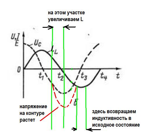 Обычное уравнение Е=dI/dt*L показывает как нужно получать колебания в обычном контуре. В обычном контуре есть изменяющийся по гармоническому закону синусоидальный ток. Для того, чтобы увеличить эдс и энергию в контуре, нужно увеличивать индуктивность контура в определенные моменты, когда скорость изменения тока максимальна и возвращать её в первоначальное состояние, когда скорость изменения тока равна нулю- в этой точке уменьшение индуктивности не влияет на эдс и энергию контура. Таким образом энергия в контуре постоянно нарастает.