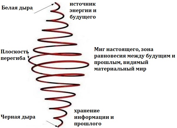 Рассматривая любой вложенный вихрь пространства-времени можно с уверенностью сказать следующее: Энергия течет по спирали из области Будущего в Прошлое, проявляясь в Настоящем в виде материи. Время, то же по спирали, направлено всегда навстречу движения энергии - из Прошлого в Будущее. Перенос информации также происходит из Прошлого в Будущее, они со Временем "параллельны", поэтому они наверное тождественны. Текущая "волна" информации из Прошлого в Будущее и энергия из Будущего в Прошлое встречаясь в плоскости равновесия "формирует" и проявляет Настоящее.