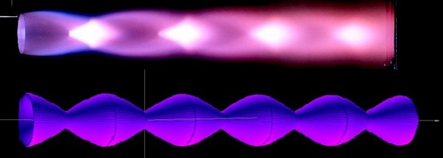 На фото - образование неподвижных конусов в сверхзвуковой струе реактивного двигателя.