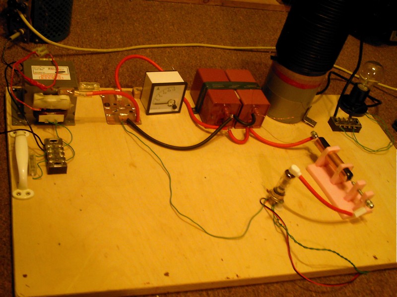 Схема собрана, устойчивая искра идет. Генерацию импульса сделал на вакуумном триоде. Импульсы шириной 20msec, частота импульсов 120Hz. Напряжение на разряднике ~2.5KV