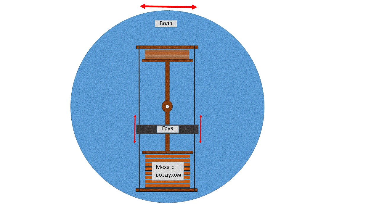 Эту модель я предложил в 2010г. Принцип явно понятный на рисунке и не требует дополнительного объяснения. Грузы всегда находятся в равновесии, а вот вода в бочке из-за движения в мехах воздуха постоянно создаёт весовой дисбаланс.