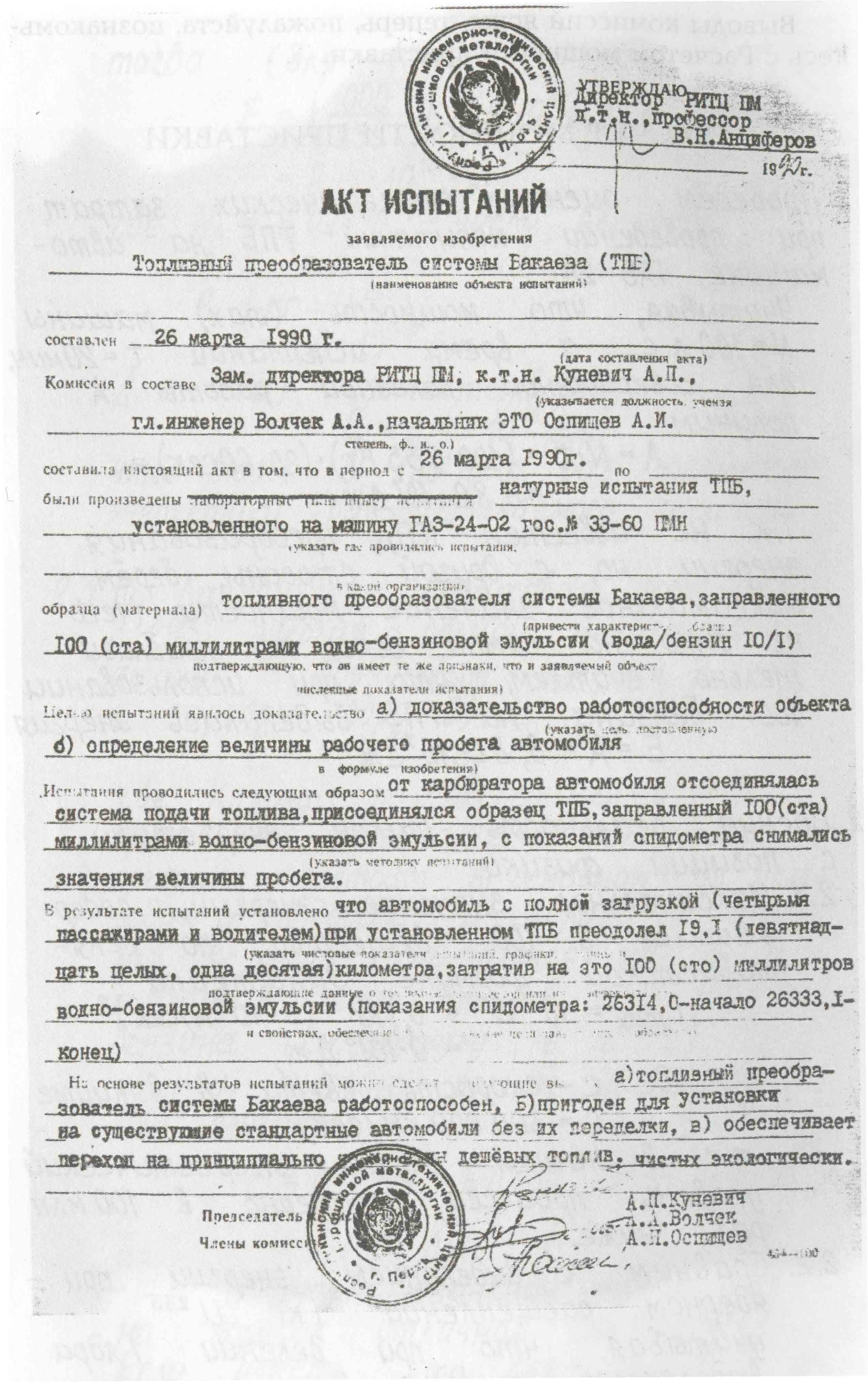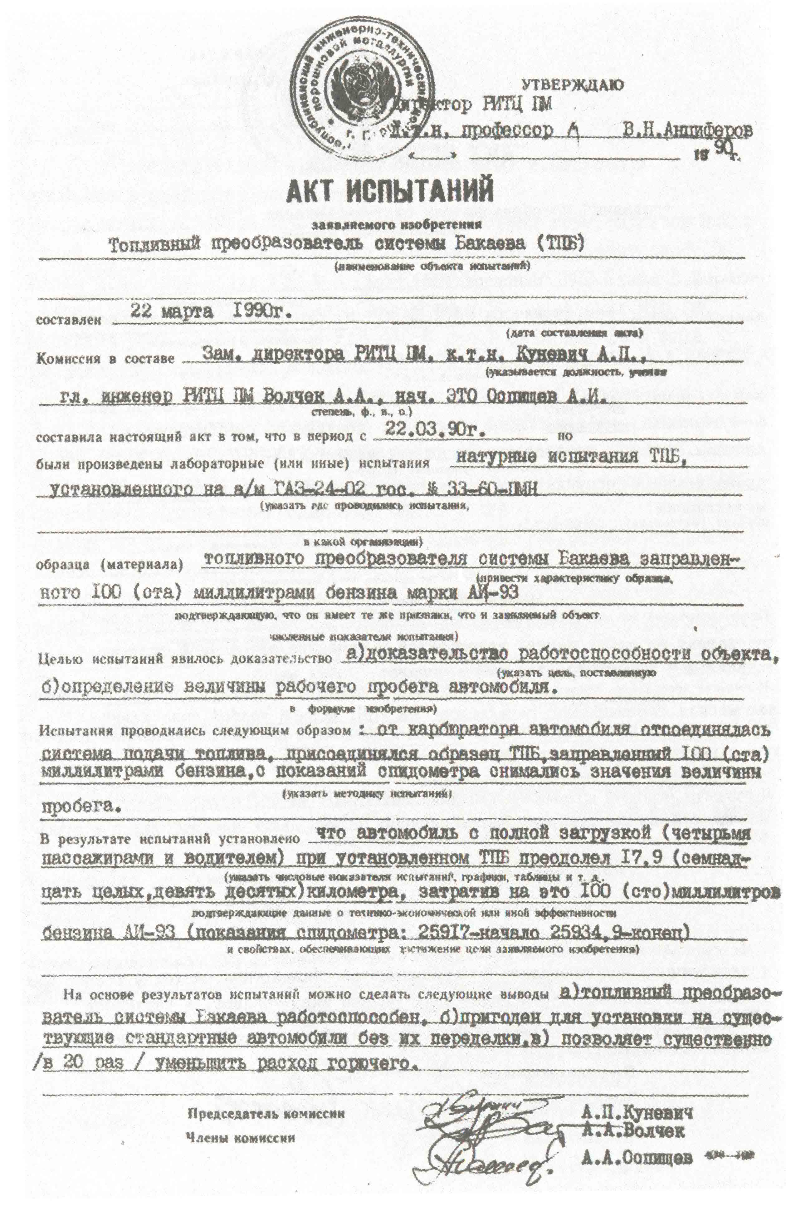 Акты испытаний абсолютно неграмотные.Запудрил изобретатель мозги своим коллегам из "Республиканского инженерно-технического центра порошковой металлургии", сели вчетвером, да поехали. И проехали аж 17 км на 100 мл бензина. В чем и все подписались.На 17-м километре "раскинули поляну", отметили это дело и обратно поехали. Дома в акте скромно так написали -"Изобретение века".