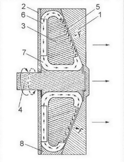 Сегодня всевозможных движителей, перемещающих различные устройства по земле, воде, воздуху и даже в безвоздушном пространстве, множество. Но новаторы стараются придумать что-либо новенькое, и порой им это удается. Как, например, изобретателю из Риги В.Ястребову (ИР, 6, 2011). Его универсальный движитель действует с помощью некоей тяжелой жидкости, например ртути, залитой внутрь корпуса 1 (см. рис.). Принцип работы основан на известном физическом явлении: вращающееся тело принимает перпендикулярное положение к оси, на которой оно вращается, если это тело закреплено на ней свободно. Вспомнив, что на основе этого явления работают многие устройства и механизмы, Валерий Иванович и сделал свой движитель. Двигатель любого вида начинает вращать ротор 3, имеющий лопатки 5, с большой скоростью. На лопатках, естественно, возникает центробежная сила. Она отбрасывает жидкость к внешней окружности ротора. Проходя между его лопатками по каналу 7, эта жидкость стремится «встать» перпендикулярно оси 4. Но на ее пути находится наклонная часть корпуса, и жидкость со всевозрастающей силой давит на эту наклонную поверхность. Движитель при этом начинает вращение по вектору силы Р. Противодействующей этому движению силы нет. Чем больше окружная скорость движения жидкости, тем сильнее тяговое усилие движителя и тем, соответственно, быстрее он перемещает данное транспортное средство. Корпус движителя надежно скреплен круглым ободом 8 с задней крышкой 2. На ней расположены неподвижные лопатки 6, предотвращающие вращательное движение жидкости.