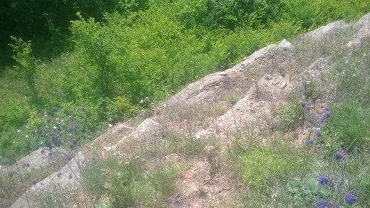 ...на фото уступы и два камешка...камешки размером 2м х 1м х 1м...их вполне можно отнести к мегалитам, кромлехам и пр...