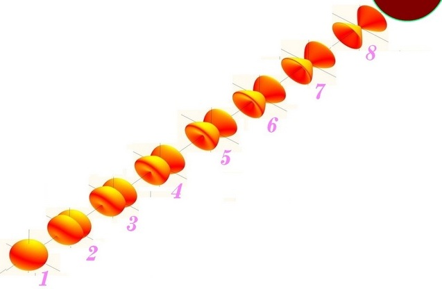 Несомненно, каждый атом по своему искажает пространство вокруг себя, и чем тяжелее ядро, тем больше искажения. Поскольку деформация глобул - процесс фазовый, то невозможно перепрыгнуть с 1 поз на 8, а должен быть процесс последовательного набега фаз 1-2-3-4-5-6-7-8