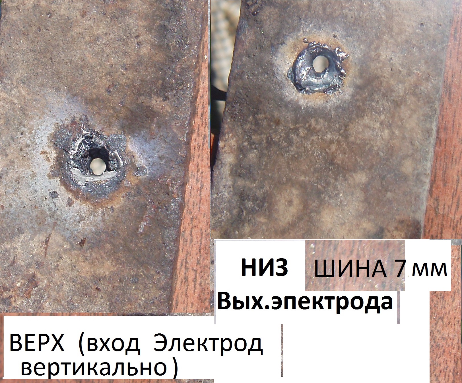 Да, меньше. Меня это озадачило, и я попробовал в этом же режиме минимального тока, с модуляцией, попробовать на толстой шине 7мм, тем же электродом 3мм, поварить. Шина горизонтально, электрод ветрикально. Ожидал что не проварит, будет куча металла в перемешку со шлаком но электрод легко насквозь провалился. Свеху вокруг отверстия было немного наплавленного металла, но он просто отвалился . Снизу , всё, как на фото