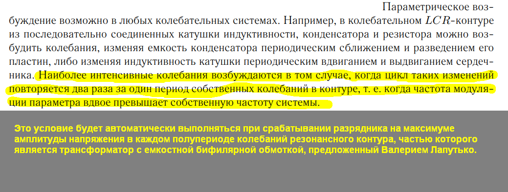 У таких спецов шаг влево шаг в право от того, что он выучил граничит с разрушением интеллекта. Я эту хрень хоть и не быстро но раскусил! Дядя Вася просто накосячил с подключением и получил режим который для простоты можно характеризовать как режим ТЯНИ -ТОЛКАЙ. А по факту это параметрический резонанс!