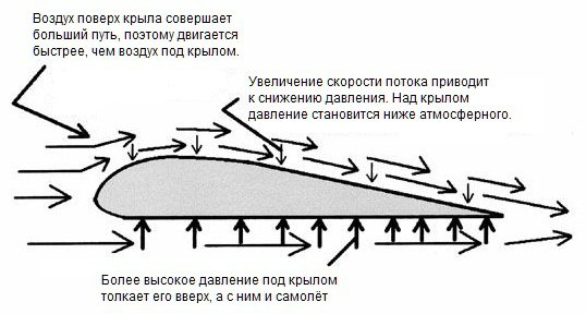 Для тех, кто не понял: над крылом при его обдуве набегающим потоком воздуха образуется область низкого давления, а под ним - высокого.