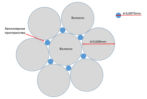 Диаметр одного волокна образующего капилляр составляет 0,049мм.