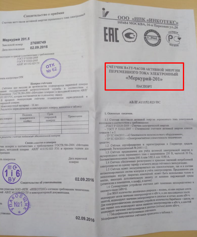Меркурий 201 - ПАСПОРТ