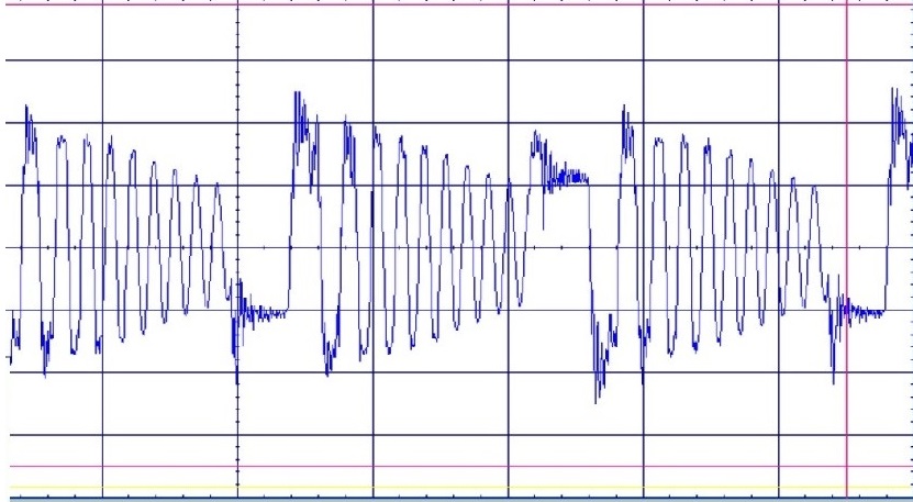 Когда я говорю, что нет обратного импульса у бифилярной катушки, я исхожу из наблюдений формы сигнала. Вот сигнал на бифиляре при максимальной выходной нагрузке. Работают два транзистора по очереди, пуш-пул. Мне не видно обратных выбросов после того как транзистор закрылся, а затухающие колебания после закрытия, видно.