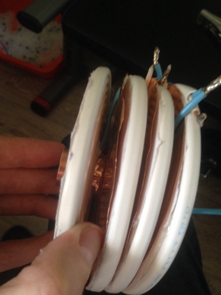 А теперь берем и заменяем центральный провод из моей схемки на медную трубку (диам 13 мм или многожильный провод 13-15 мм кв.) . Обмотку заменяем на плоские катушки (бифиляр Теслы) - шт 3-4. Соединяем последовательно. Напряжение от источника питания - от 2500 вольт. Плоские катушки можно мотать двужильным плоским кабелем 2х2,5 мм кв. (применяется для внутренней разводки). Для увеличения передачи ставим между плоскими катушками экраны из медной фольги, которые соединяем с медной трубкой (не пайкой).