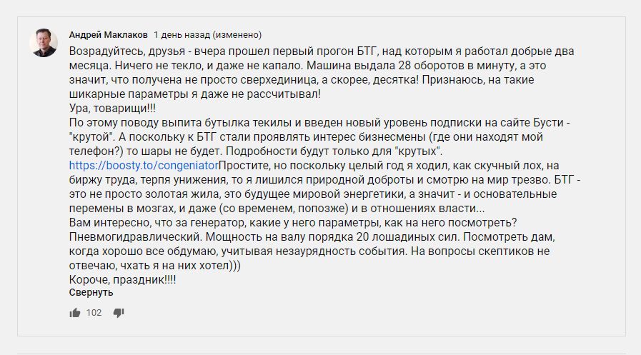 Мужик пишет, что испытания дали 20 кВт при десятикратной сверхединице.