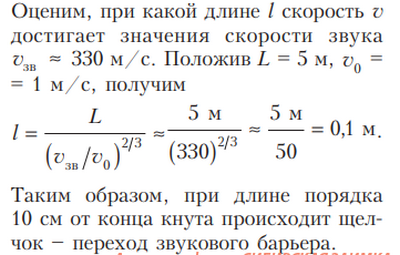 ..на конце кнута амплитуда очень сильно возрастает за счет бегущей волны, удар в конце кнута имеет очень большую энергию.