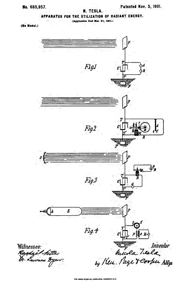 Ничего подобного.Там киловольты наводятся и энергии столько-что можно и реле щёлкать и храповики крутить без внешнего питания.Я же говорил.Где видео.Схема-одна и та же почти во всех патентах Теслы. ВВ БП,ВВ конденсатор,разрядник и резонатор включенные последовательно,как в видео.Только там в роли резонатора выводы от конденсатор к разряднику.Патент немного обрезан.На первом рисунке Солнце.Тесла так прикалывался,что и трубку рентгеновскую тоже нарисовал.Это для просто повторяющих и не напрягающих голову.Без генератора ни одна схема работать не будет.А про нейтроны я тоже догадался-это они проходя через тело в рентген превращаются.