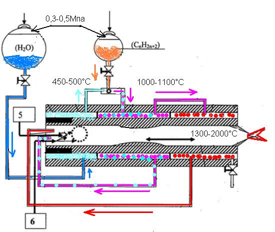 А вот в видео мужик мало железа использует потому и горючка нужна, а так бы ведра 3-4 набрал ржавых болтов, гаек, гвоздей и другой железной мелочевке, разместил в емкости и нагрел паром до 7000С то на выходе получил бы гремучку. Смысл в этом теплообмене, ведь железо все равно у него расходуется, а так бы на отопительный сезон хватило. Ведь на входе 7000С, а на выходе из емкости с железками 30000С, только это тепло нужно снимать теплопроводным способом т.к. при горении водород практически не излучает тепло.