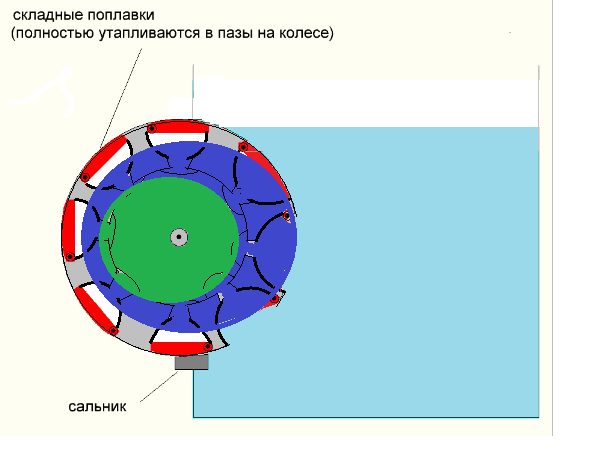 Попробуйте рассмотреть подобное "колёсико" не с нишами ("пазами") для поплавков, а сплошную оболочку из таких же оттопыривающихся поплавков вплотную друг к другу.