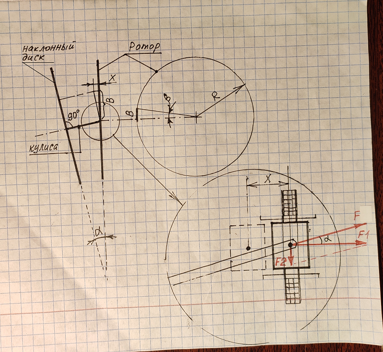 Найдем величину работы А1, которую выполняет сила F1 при повороте ротора на малый угол β. Центр катушки сместится по окружности на расстояние B=R* β. Расстояние от центра катушки до центра магнита изменится на величину x=B*tgα, где α – угол между касательной к окружности в центре катушки и касательной к окружности наклонного диска в точке крепления кулисы.