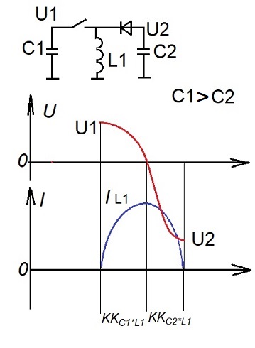 Энергия перетекает из одного контура в другой (если не учитывать падение на диоде) на каждом цикле перезаряда с потерей части энергии, равной 1/Q*100%.
