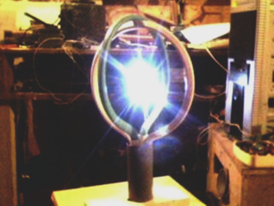 Материал как видно жилы силового кабеля энергетиков.Частоты думаю не имеют значения.Так как такой эффект производят импульсы тока.Это есть в доке из первого сообщения-светящаяся точка в центре кольцевого резонатора.На ум приходит только концентрация радиантной энергии в центре кольца и как следствие-свечение воздуха в этой области.