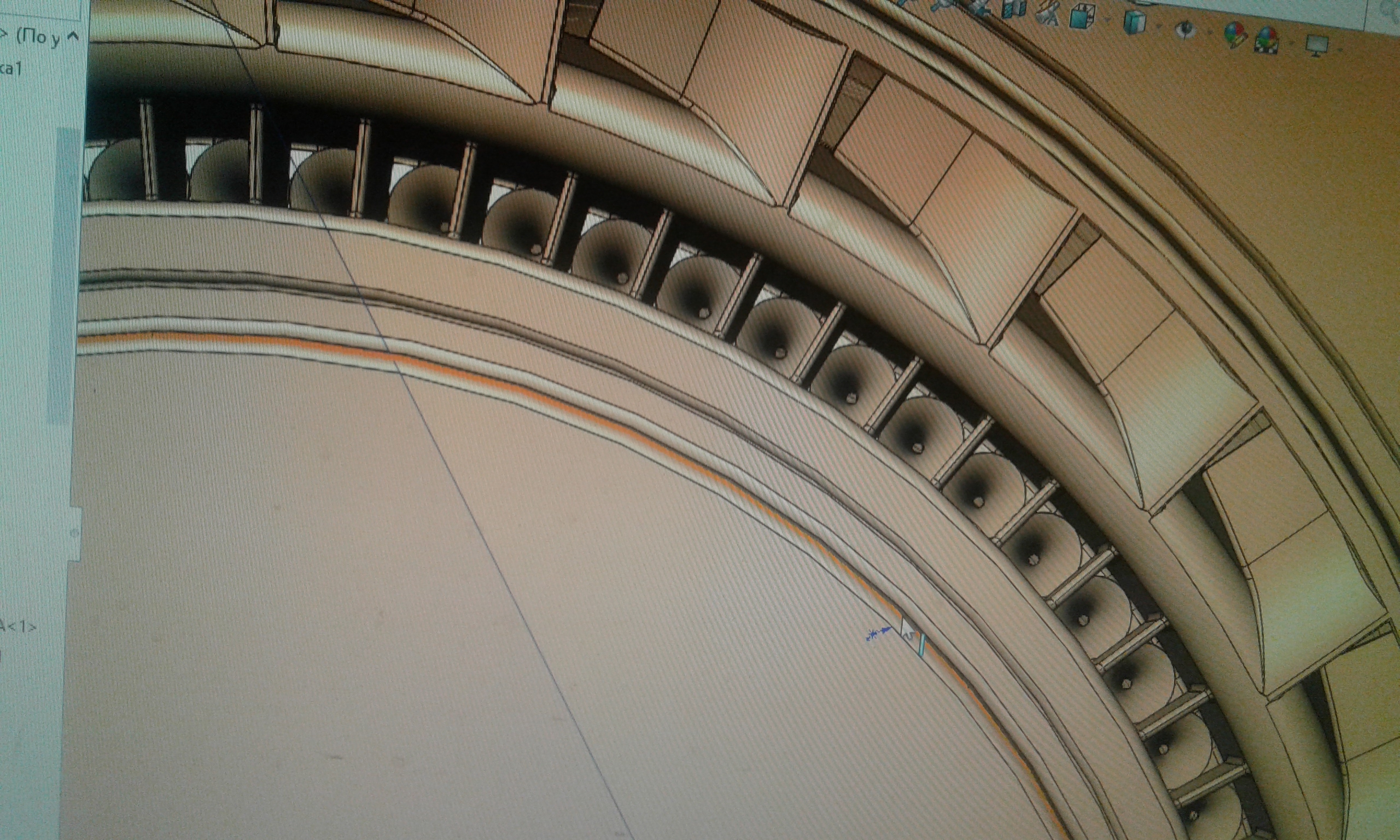 В процессе рпзработки системы я кое что изменил, но принцип остался тем же. Я изменил расположение рычага относительно ролика, теперь ролик накатываясь на рычаг, не отдаояется от оси рычага, а наоборот приближается к его оси. Это позволяет увеличить амплитулу движения рычага без увеличения его выступа. А главное, что при таком расположении поворот рычага происходит с увеличением угловой скорости. На приведённых картинках видно, чтоугол отклонения рычага в несколько раз больше чем его выступ вовнутрь окружноси (обечайки)