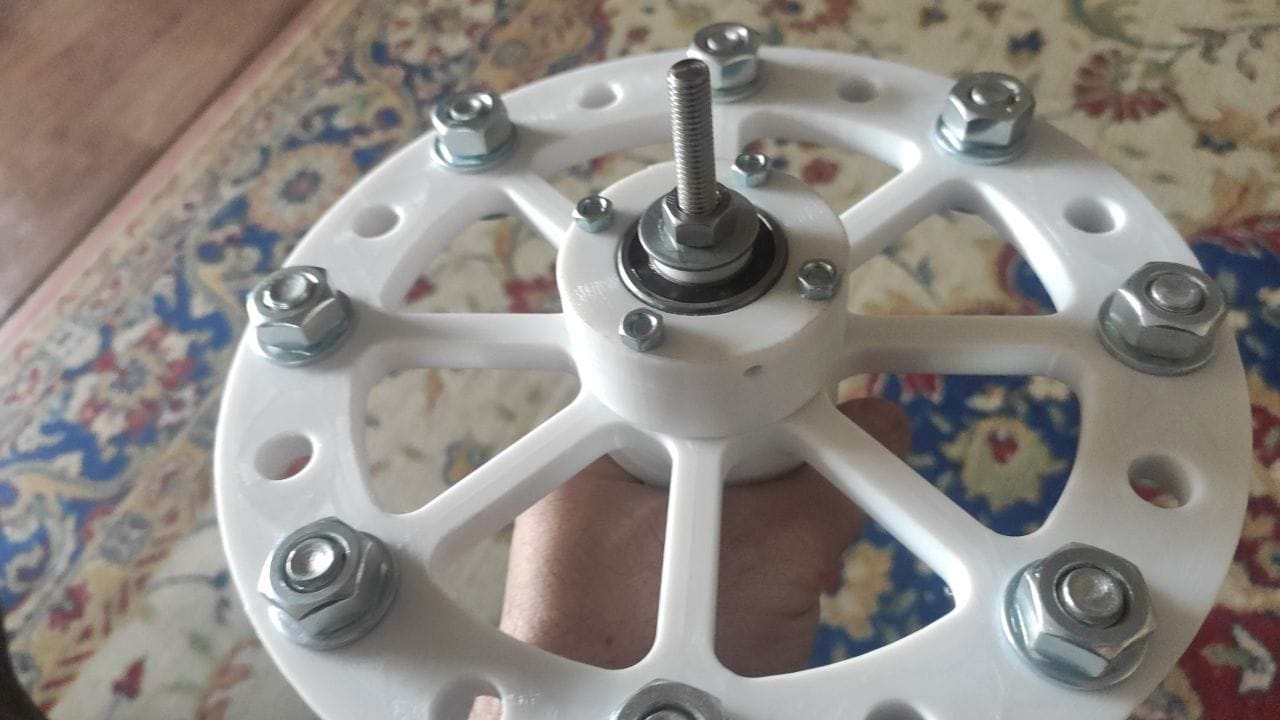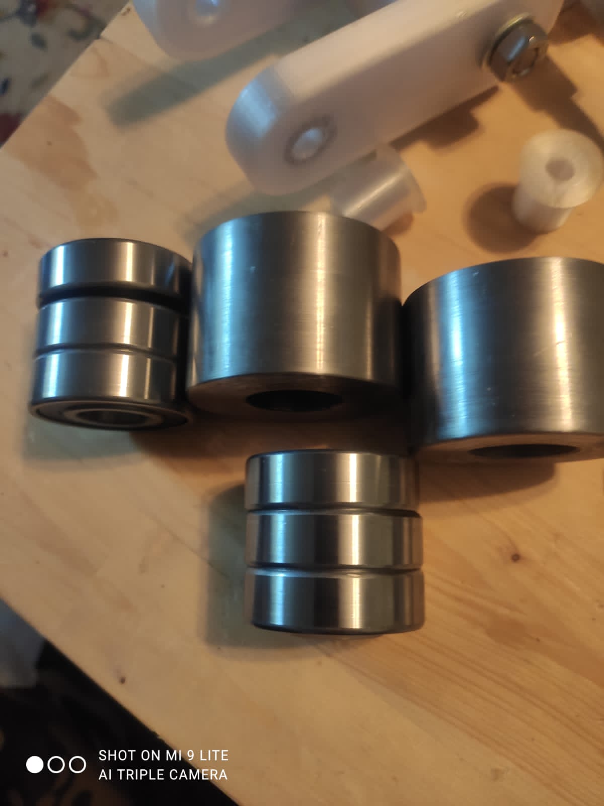 Произвёл замену роликов на своей установке, чтобы снизить трение. Первые ролики были собраны из обычных подшипников по три штуки на каждом плече. Трение больших подшипников ухудшало работу установки. Подшипники заменил на цельные ролики с двумя маленькими подшипниками. Трение заметно снизилось. К тому же вес роликов больше чем был у подшипников, это увеличило центробежную силу и увеличило крутящий момент ведомого колеса. Теперь остановить его стало на много труднее.