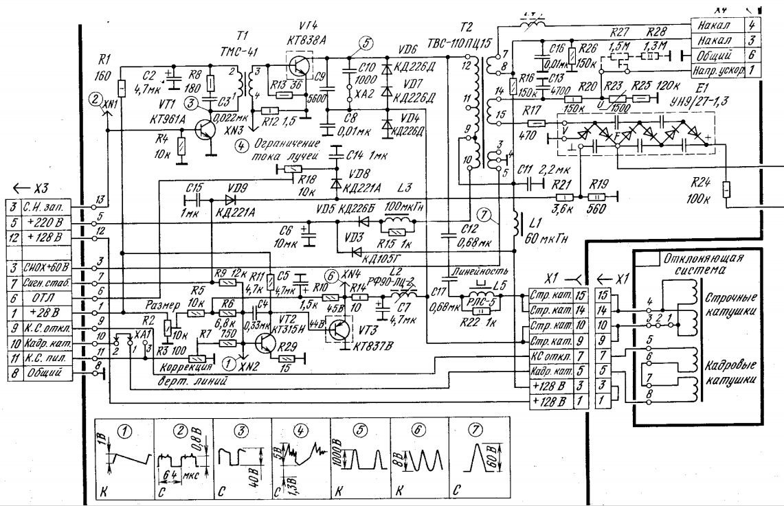 Осталась плата блока питания,МП-3-3С,Плата субмодуля синхронизации УСР плата модуль строчной развёртки МС41-1и пока плата соединительная.Если сможешь позачёркивай на на МС-41-какие элементы можно убрать.Снимать буду прямо с ВВ обмотки ТВСа. Там в районе 5-7Кв.Дуга горит.Проверил. Отключено-значит реально отсутствуют.Платы удалены с разьёмов.Телевизор был Электрон ТЦ-451- ТЦ-450