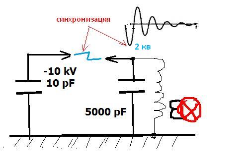 Зарядили кондер 10 пик до 10 кв. Он стрельнул на кондерчик 5000 пик и напруга на нем подпрыгнула на 200 вольт. Это реальные цифры, я тебе потом картинку с ослика покажу.