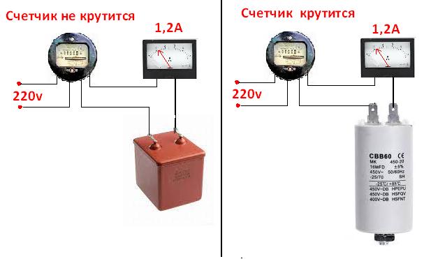 Включаю советский конденсатор в сеть, ток 1,2 А и счетчик не крутится.😬 Потом подключаю импортный, от стиралки и смотрим. Ток тоже самый, а счетчик крутится. Вот вам и разница между хорошим и плохим конденсатором😊