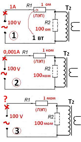 Абракадабра знаешь что такой?😊 Ты хоть понимаешь, какой мощность потеряется на ЛЭП, если его огромное сопротивление (R1) будет ограничивать ток в цепы?😬 Сайрус, низкий ток в цепи обеспечивает не ЛЭП, а понижающий трансформатор Т2 высоким входным сопртивленыем (R2). А, сопртивление ЛЭП-а и соответственно потери, считается мизерным... Только твоих расчетах теряется почему то огромная энергия на ЛЭП. 😛 Блин, ты вообще в схемах разбираешься, или только вертушки умеешь собирать?😊 Напряжение на первычке трансформатора сам считай, ты же знаток закона Ома😛