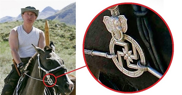 И ты такой же. Вглядись внимательно, увидишь голову слона. То исть в буддийской стране сделан снимок. А у буддистов свастика была и осталась священным символом, они её везде суют, даже в упряжи коней. Немного поразмышлять, и можно сообразить, что Путин был в гостях у Шойгу в Туве. Вот и вся связь.
