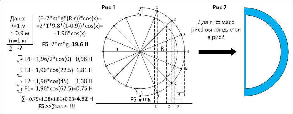 Ты просто считаеш не правильно. Смотри эту схему. Посчитай какую разницу сил создадут десять грузов с разной долнной рычага, а потом посчитай разницу сил созданную сотней таких грузов.