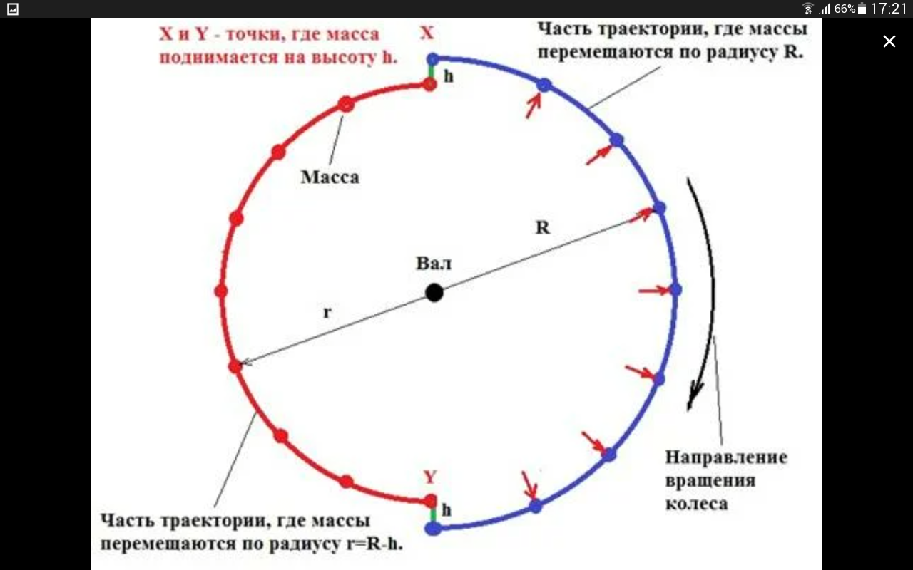 sairus Пост: 756179Для поднятия двух грузов по на высоту 30 см нужна определённая сила. А если мы увеличим количество грузов, то увеличится крутяший момент колеса. А сила требуемая для поднятия двух грузов вдоль их рычагов остаётся не изменной. Ты считаешь сколько нужно энерии на СОЗДАНИЕ разности сил , а надо считать энергию на поддердание уже имеющейся разности сил. В этом и есть твоя ошибка,