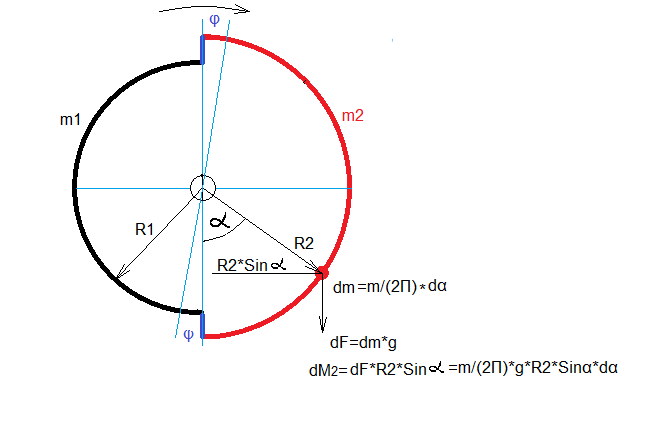 m1=m2=m/2 - масса грузов левой и правой части колеса АК. Грузы равномерно распределены по полуокружностям колеса.