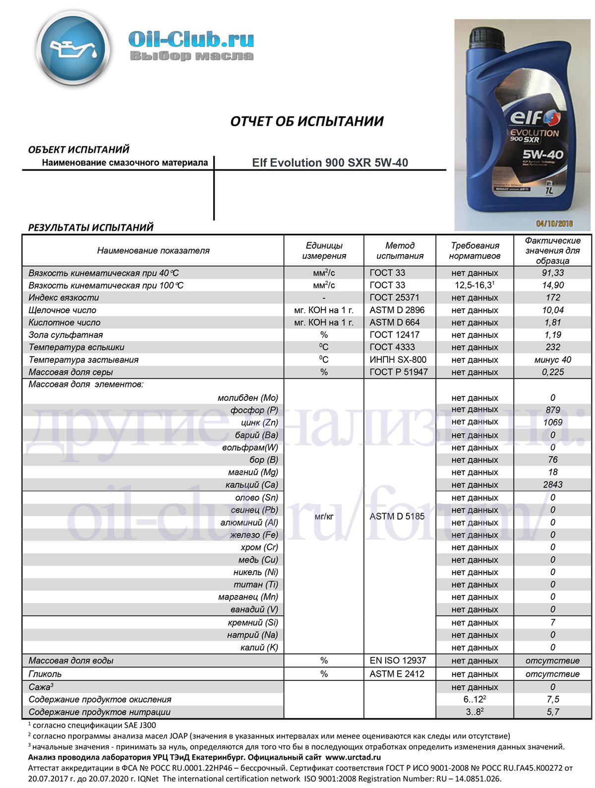 Для сравнения лаб-анализ с Оилклуба Elf Evolution 900 SXR 5W-40