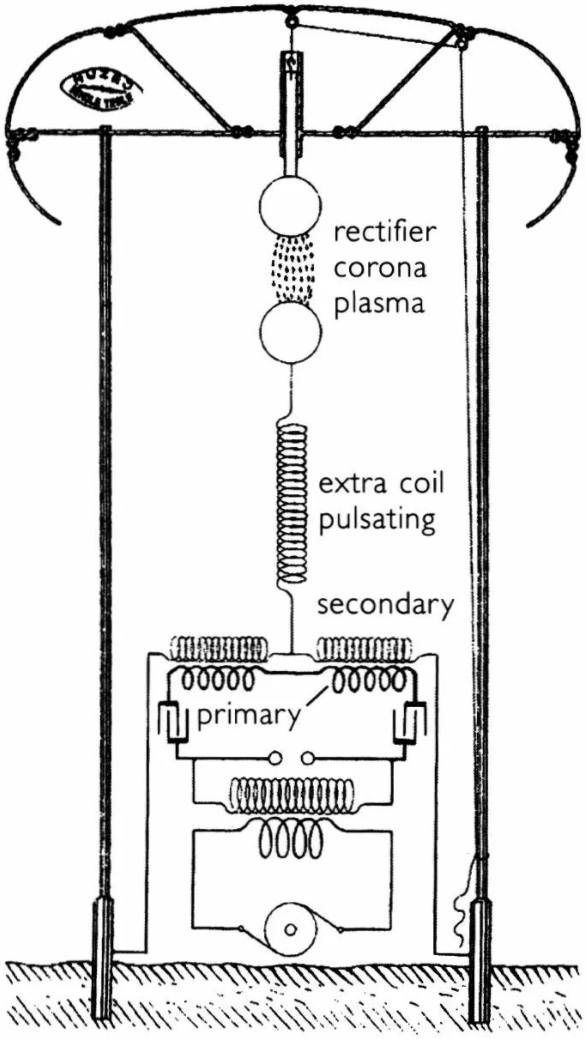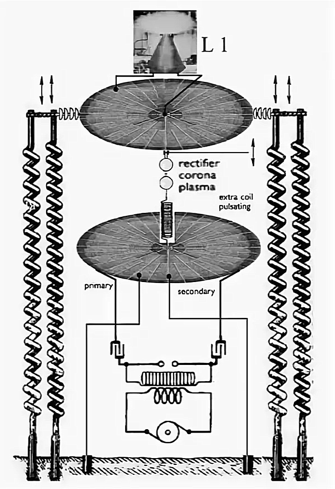 Да всё просто-установка Н.Теслы-это импульсный приёмопередатчик,что-то на подобии радиолокатора,но на работающая продольных волнах.Т.е открытая система для извлечения энергии из окружающего пространства.
