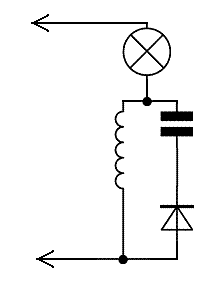 С какой бы частотой не работал генератор, ток потребления от источника питания никогда не превысит половины тока свечения лампочки , если бы не было ёмкости -индуктивности-диода.