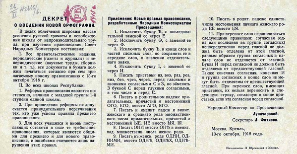 Декрет Совнаркома от 10 октября 1918 был продавлен Яшей Свердловым (Гаухманн Аарон Мойшевич). Ленин тогда был на больничном, недостреленный тем же Яшей. Реформу русского языка пыталось учудить еще временное правительство, состоящее сплошь из масонов. Яша также был зачинателем и вдохновителем Красного террора, который в октябре 1918 как раз начинал свое кровавое шествие по России. Совпадение?
