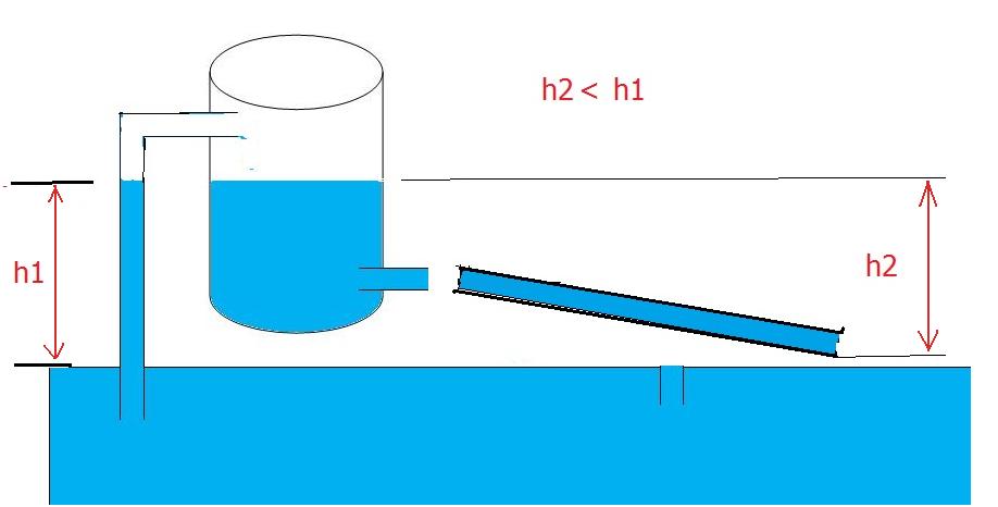 При создании разряжения в бочке, работает не само разряжение, а разница давлений между разряжением внутри и давлением с наружи. Но давление есть как на входе так и на выходе. Это давление и там и там одинаково. Разница лишь в высоте водяных столбов. И там где водяной столб выше, будет и перевес. Если на выходе водяной столб меньше, чем на входе, то столб на входе всегда будет перевешивать. Диаметр и наклон труб значения не имеет и роли не играет. Работает только расстояние между нижней и верхней точкой жидкости в трубе, его и следует считать высотой водяного столба.