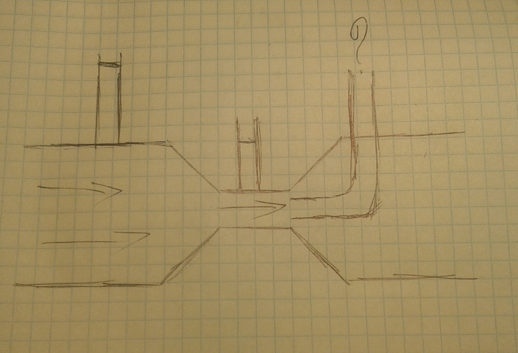 Просто нарисуй вектора действующих на все потоки сил. Нарисовал схему , сразу рисуй вектора сил. Тогда тебе будет легче разобраться и понять, что и как. Рисуй направление вектора силы гравитации потом направление атмосферного давления, если есть другие составояющие такие как сила инерции сила кориолиса цбс и прочее их тоже рисуй. А я помогу тебе разобраться с тем, какая сила больше и какая меньше, и что куда в в итоге потечёт. Главное нужно помнить, что причиной любого движения является разность сил, действующих на тело, которым в данном случае является жидкость. Я не верю в закон сохранения энергии, но есть вполне рабочие законы и их обмануть не легко.