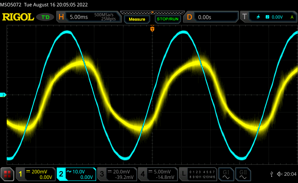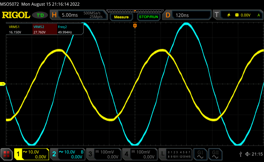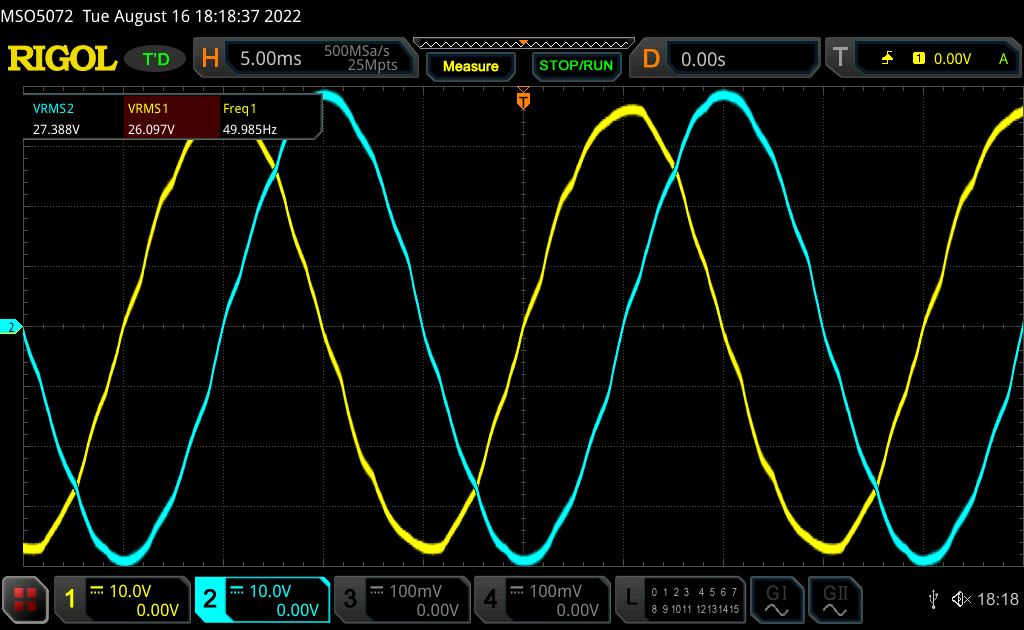 Желтым - ток (1мВ = 1мА) ток примерно 200мА, чтобы не вгонять его в насыщение, при таких параметрах этот кусок ЛАТРА, на который я его вывел, сдвигает фазу тока не более чем на 45 градусов.