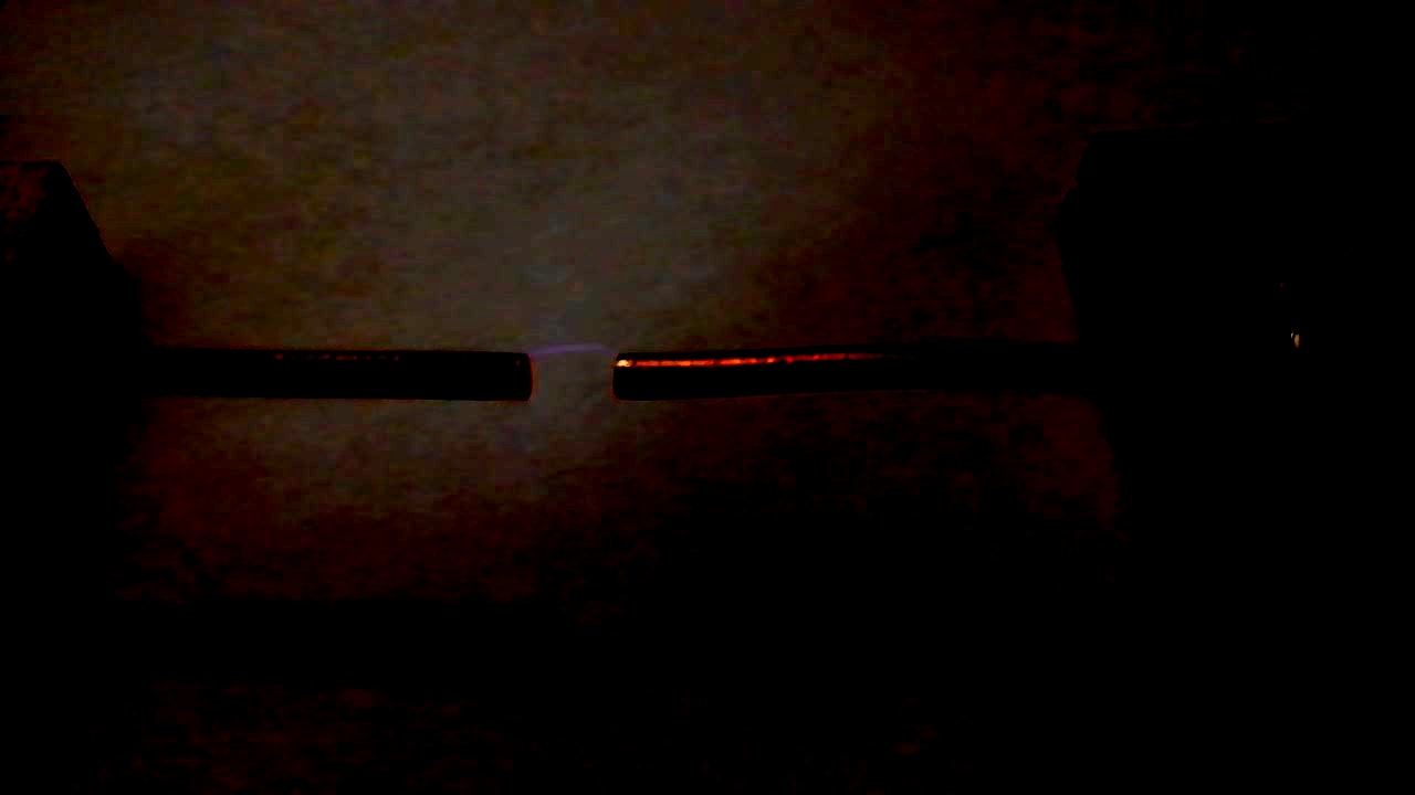 Я встречал похожий разряд. Один вариант это заряд типа ёмкости у которой организована слив - утечка заряда в окружающее пространство. Второй вариант - накачка двух ТДКСов от одного генератора. Один ТДКС заземлён , второй просто висит в воздухе. Между концами ТДКСов похожий разряд. Если на конец второго ТДКСа подключить ёмкость одной клеммой, она заряжается довольно прилично. Меня это несколько озадачило. Оставил на потом...