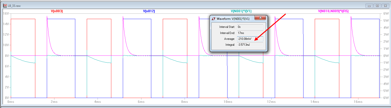 Следующих (2-й и 3-й)два скрина это измерение мощности потребляемой из источник(зеленым) и мощности выделившейся в нагрузке R5(фиолетовым).