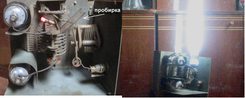 Ну попробовал я все это. Антенну делать бессмысленно. 1/4 длины волны это 2.5 метра. На конце будет не более 200 вольт. Так что я сунул пробирку с соленой водой в контур. За 10 минут вода нагрелась градусов до 80. Никакого электролиза нет. Пузырьков нет. С поверхности тоже ничего. Пробовал огонь. Ничего горючего не выделяется. Вот фотка, где пробирка лежит в контуре. Справа, для оценки работы генератора, фото горящей лампы дневного света, расположенной рядом с контуром.