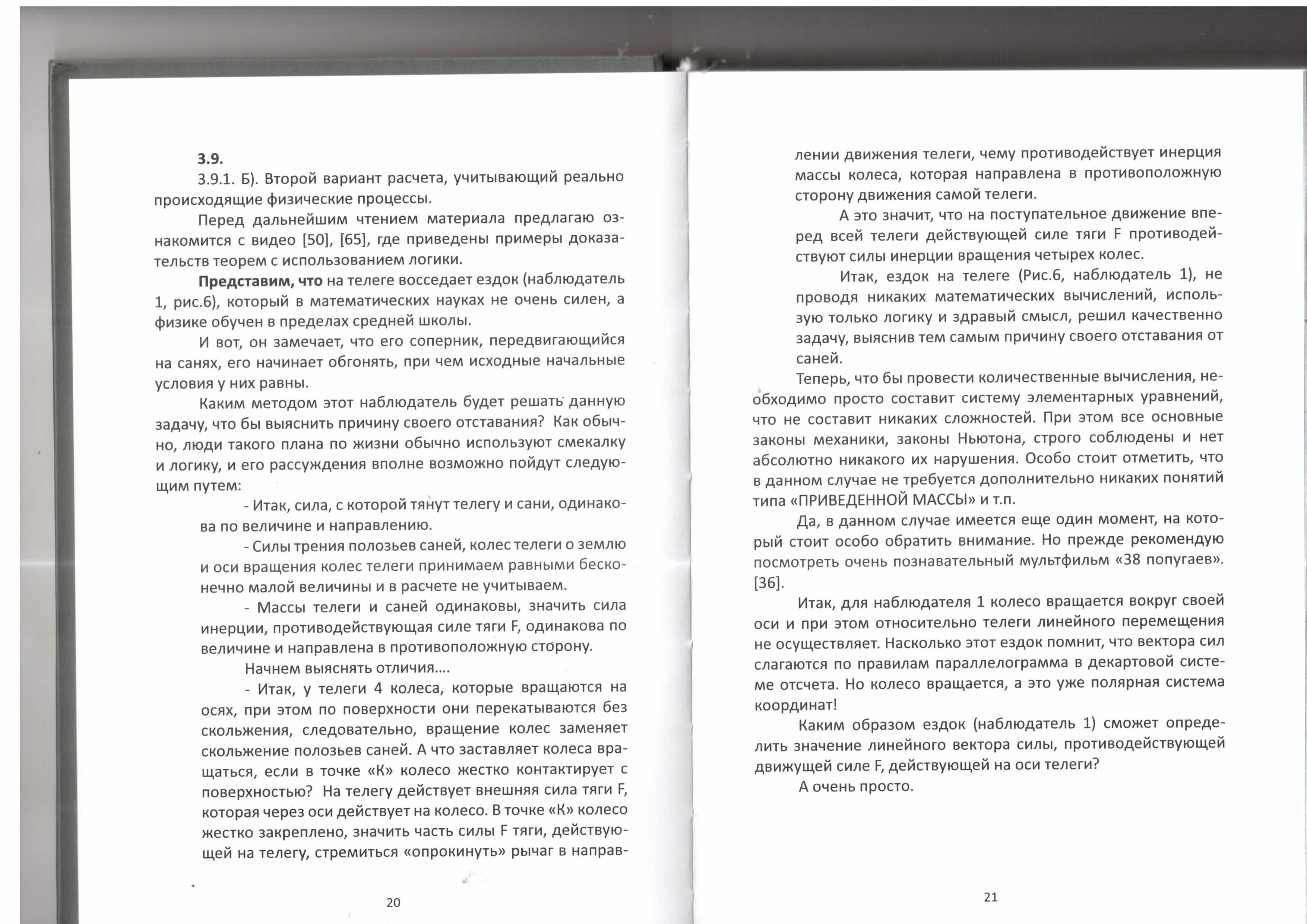 Прим: так, на минуточку. Инерция проявляет себя только в моменты ускорения/торможения , но колеса как следует из текста, крутятся равномерно. Какая тут нахрен , инерция ? И уж коли сани стали догонять - перегонять, то при прочих равных как пишет автор, их инерция больше нежели инерция всех четырех колес телеги, ведь их масса больше массы колес, а вот она почему то не учитывается.
