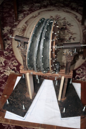 Этот угол позволяет создать необходимые для непрерывной работы двигателя условия, – поясняет нам кыргызский Кулибин. – Сохраняется дисбаланс внутреннего объема и массы. В итоге мы с вами наблюдаем, как разработанный мною резервуар с водой и воздухом начинает свое непрерывное вращение. Оно, в свою очередь, передается на оси, которые при помощи специальных преобразователей генерируют энергию, вырабатываемую механизмом, в электричество. Есть и второй вариант, при котором мы можем обойтись без осей вращения. В этом случае нам и пригодятся те самые колесики, которые расположены под барабаном. Они также при соблюдении определенных норм способны стать проводником (как и оси вращения) для передачи энергии в генераторы.