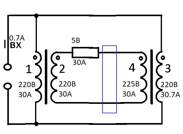 Всё правильно. но пока конденсатор не учитывай,убери его. Сколько ватт проходит через синий прямоугольник? Я пока пытаюсь добавить изоляцию на обмотки трансформатора который будет выполнять роль токового автотрансформатора