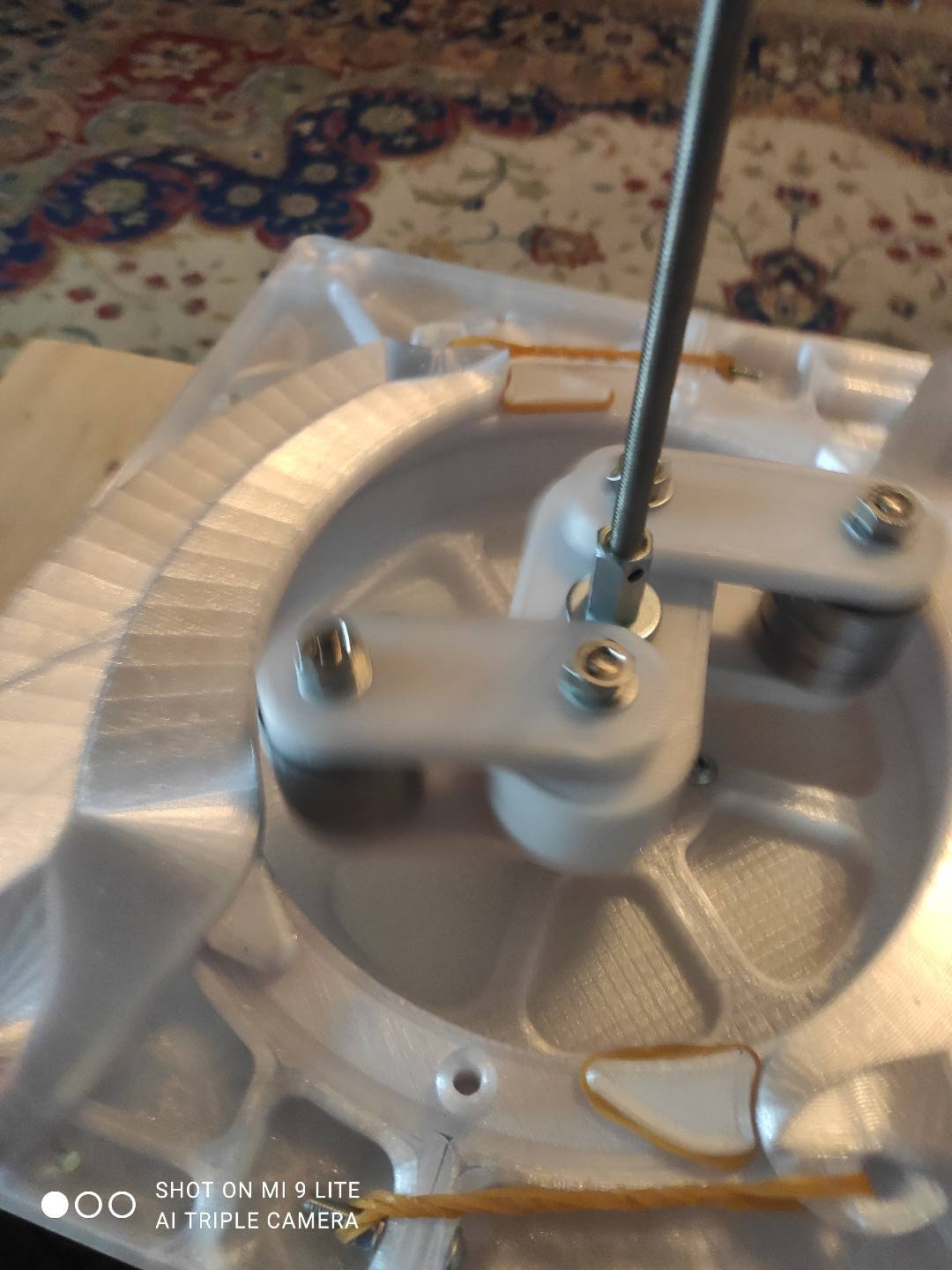 Рычаги имеют массу и притянуты резинками к корпусу эти резинки возвращают рычаги на место. Ролики выполняют работу по ускорению массы рычагов, своей центробежной силой,@ а так же по растяжению резинок. Каждый ролик давит на рычаг силой 15кГс. Максимальной нагрузкой на рычаги может быть полный заклин. После заклина рычагов моторчик вращается и ролики продожают давить на рычаги с такой же силой, ни какая нитка там не рвёрся. Отпускаешь рычаг он продолжает работать крутящий момент на оси рычага очень большой